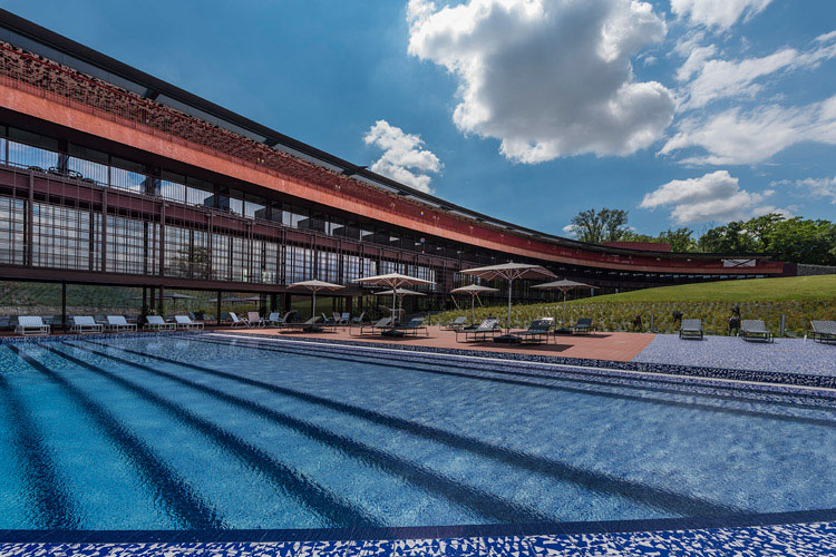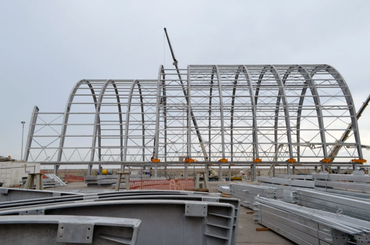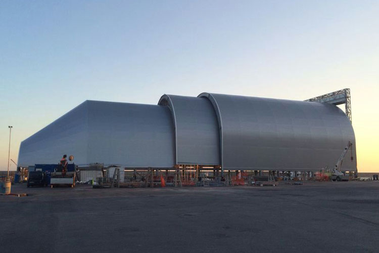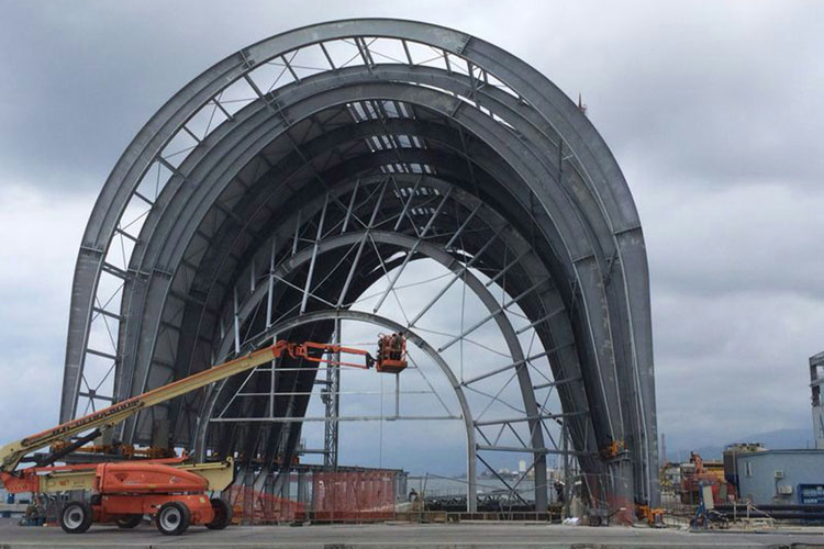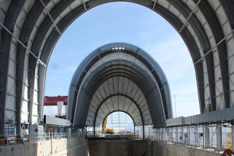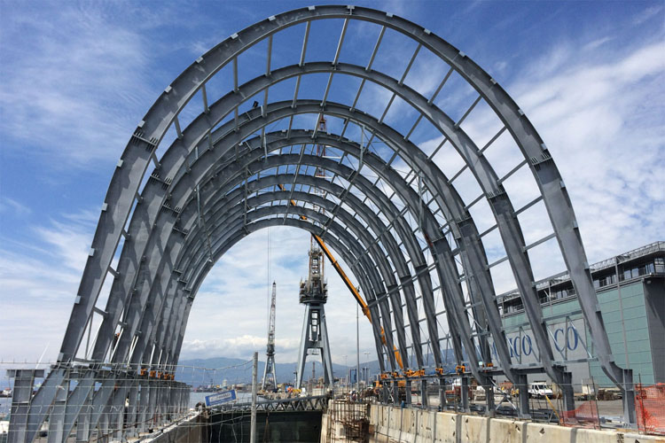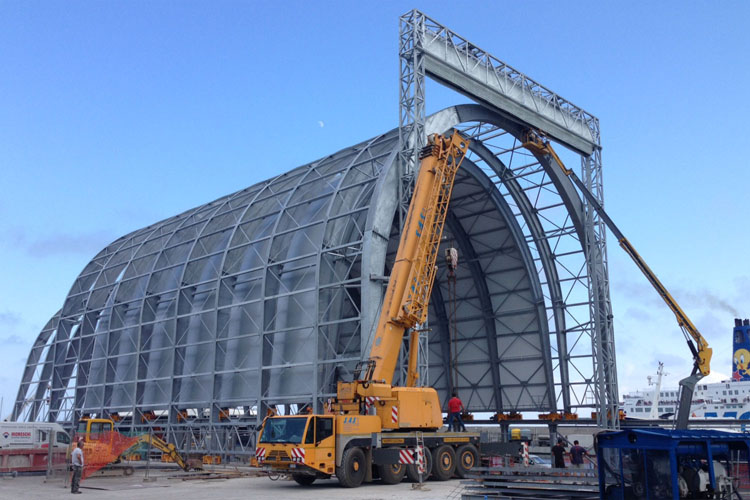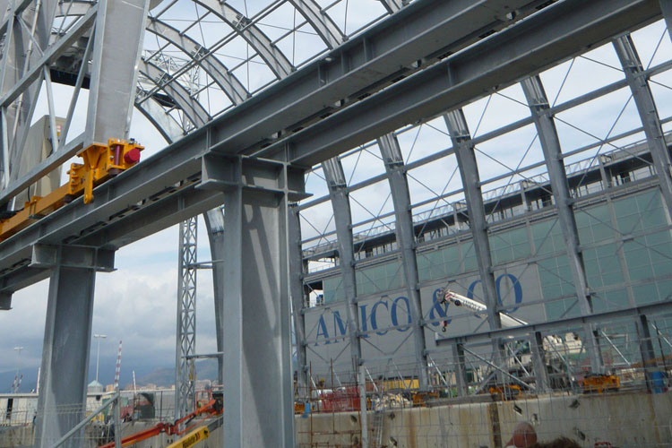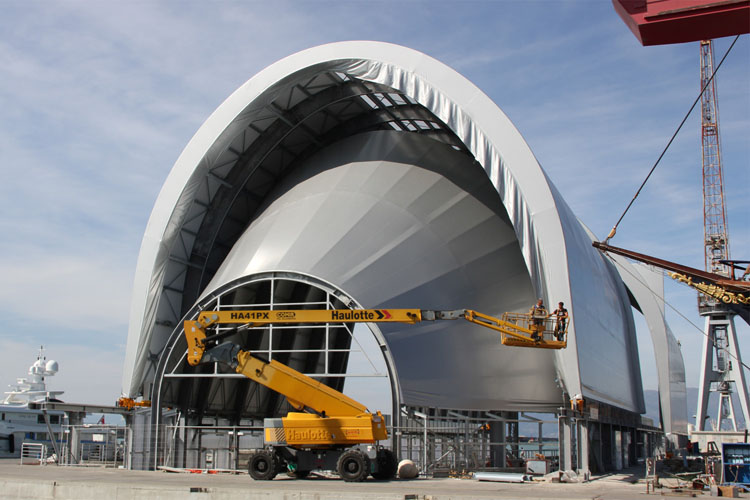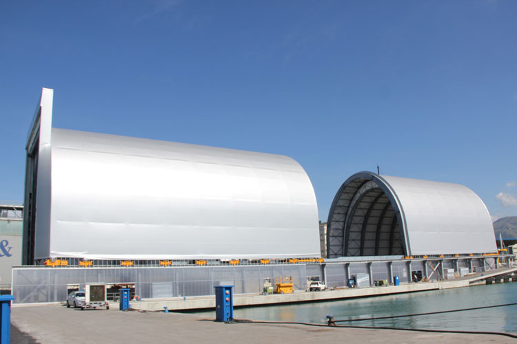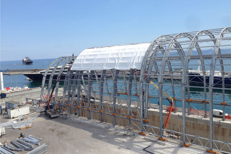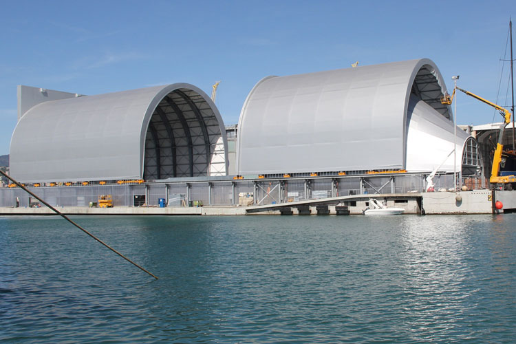 Dry Dock for yacht repair and maintenance. The roof of the dry dock, made of steel parallel arches, is divided into 3 sections able to close above themselves (being 2 of them movable and 1 fixed)