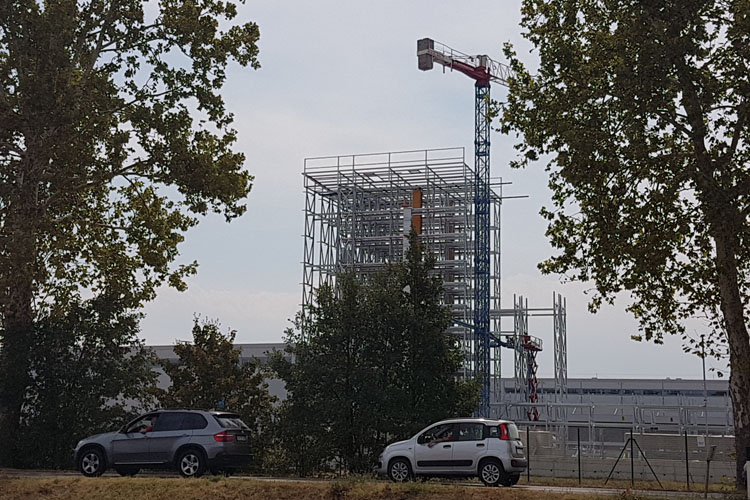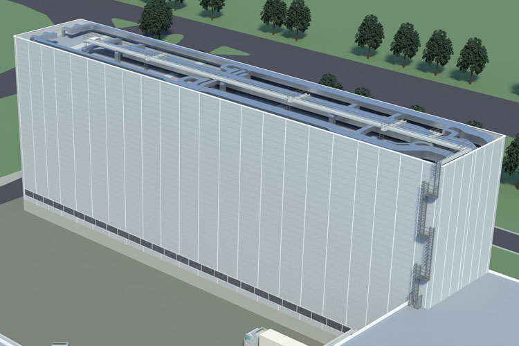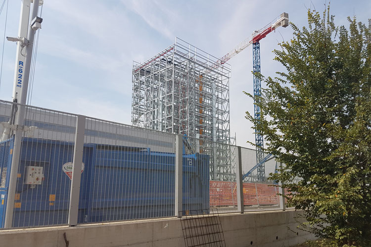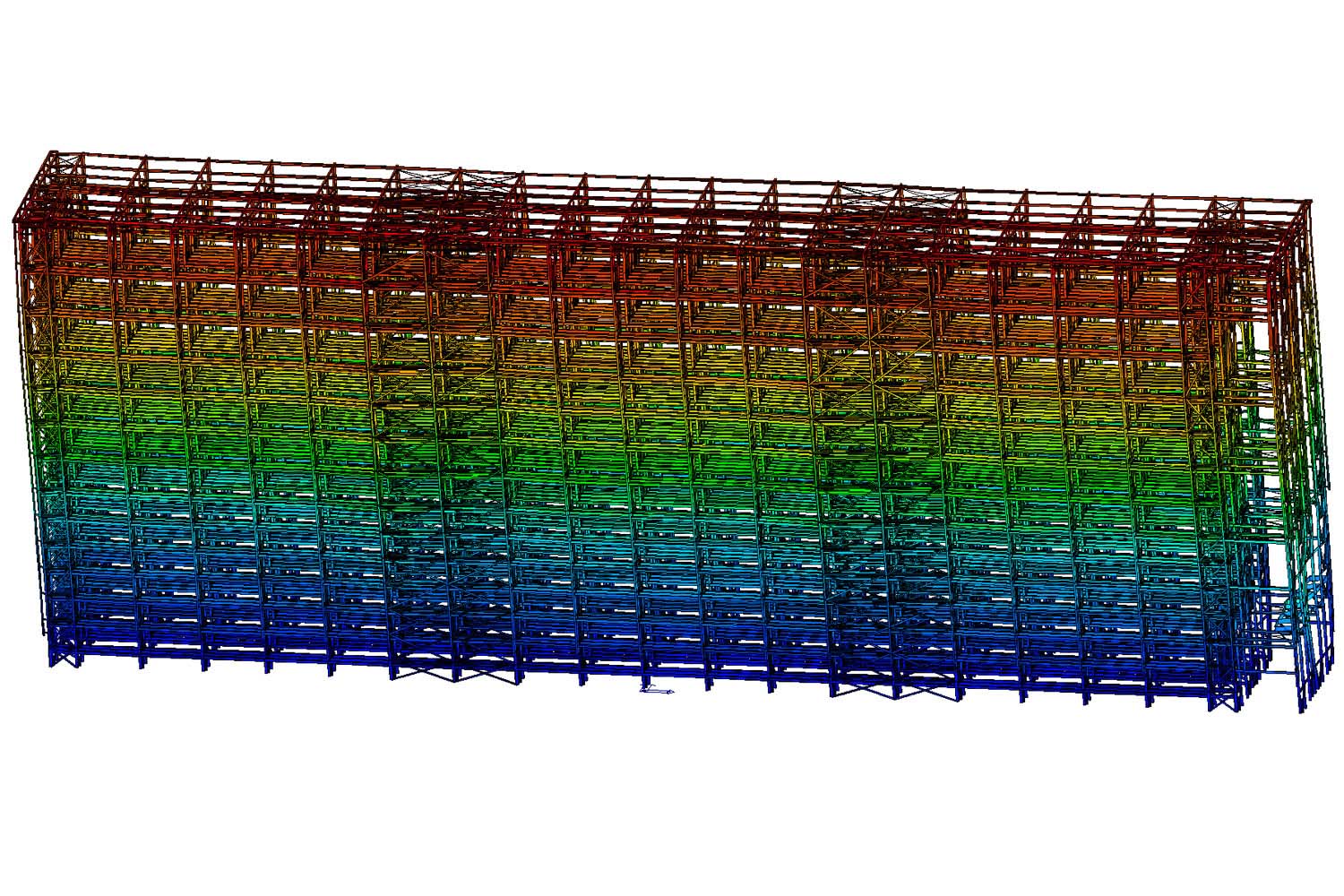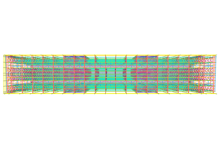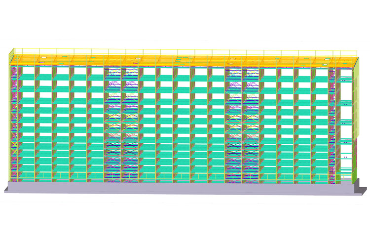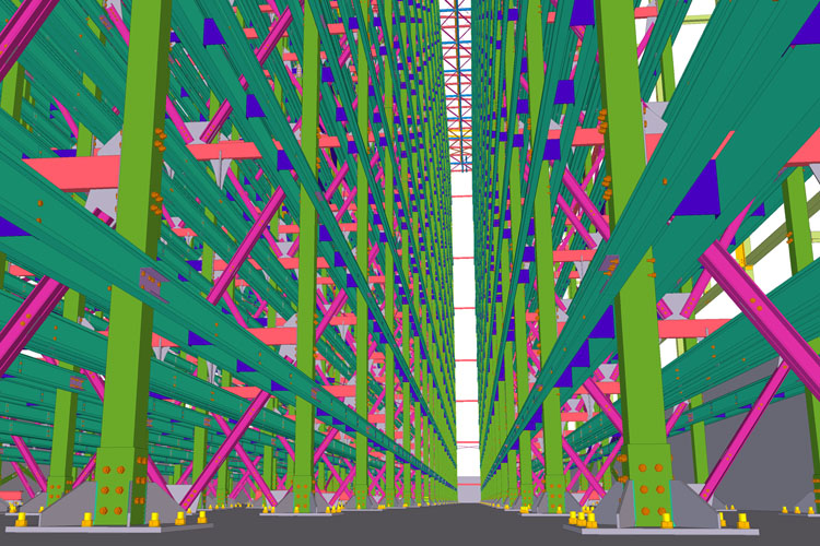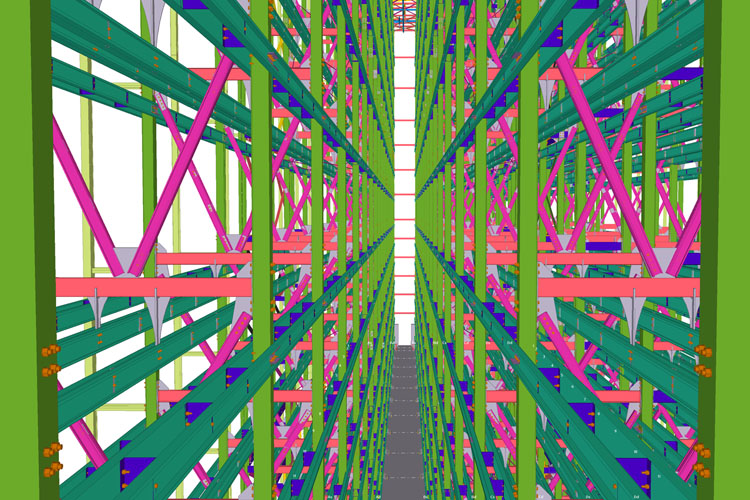 Self-supporting racks with split levels for pallet storage. 1300 m2 covered area for 33 meters height. 18 bays, 4 racks with 2 aisle in between, 13 levels.